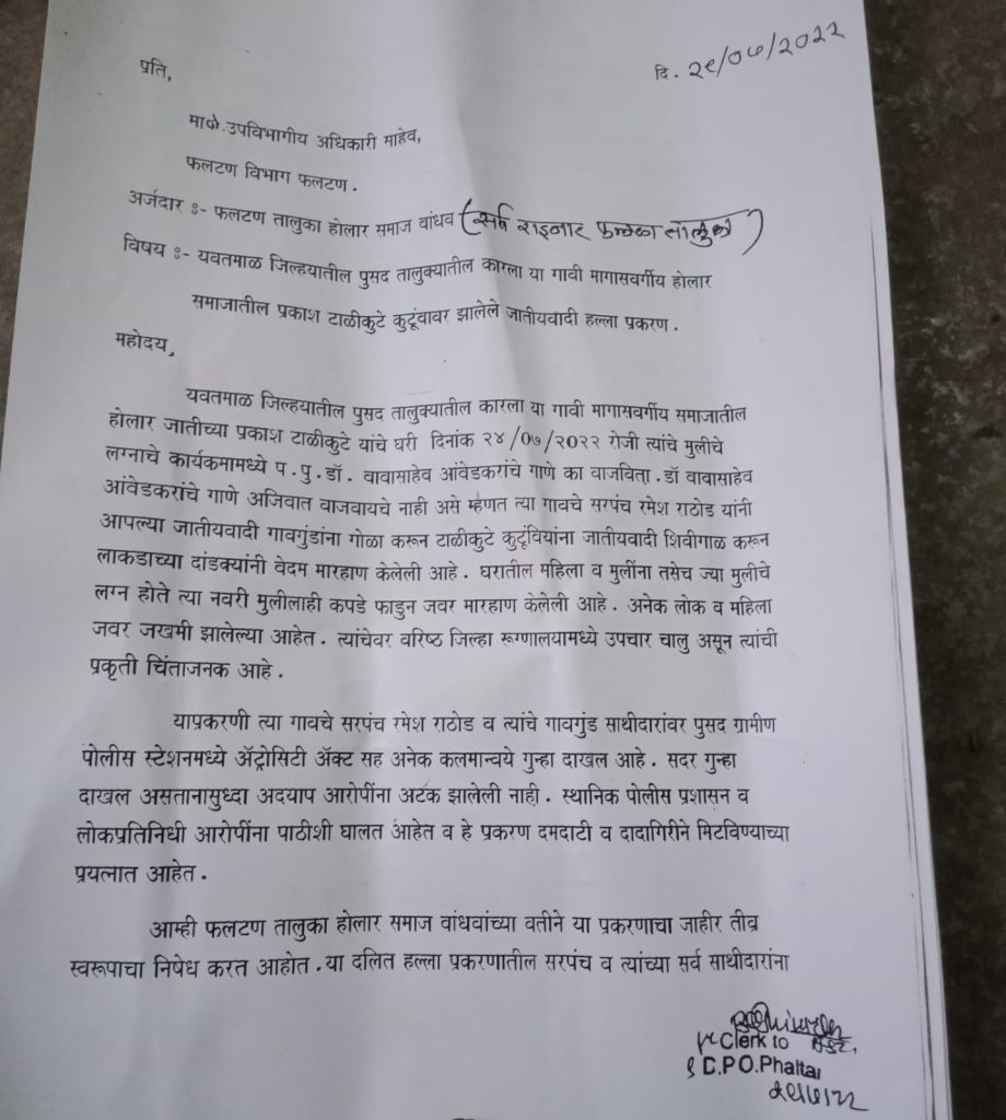 फलटण : यवतमाळ जिल्ह्यातील पुसद तालुक्यातील कारला या गावी मागासवर्गीय समाजातील होलार जातीच्या प्रकाश ताळीकुटे यांचे घरी दिनांक २४/०७/२०२२ रोजी त्यांचे मुलीचे लग्नाचे कार्यक्रमामध्ये डॉ बाबासाहेब आंबेडकरांचे गाणे का वाजविता. डॉ बाबासाहेब आंबेडकरांचे गाणे अजिबात वाजवायचे नाही असे म्हणत त्या गावचे सरपंच रमेश राठोड यांनीगावगुंडांना गोळा करून टाळीकुटे कुटुंबीयांना जातीवाचक शिवीगाळ करून लाकडाच्या दांडक्यानी बेदम मारहाण केलेली आहे. घरातील महिला व मुलींना कपडे फाडून जबर मारहाण केलेली आहे.अनेक लोक व महिला जबर जखमी झालेल्या आहेत. त्यांचेवर वरिष्ठ जिल्हा रुग्णालयामध्ये उपचार चालू असून त्यांची प्रकृती चिंताजनक आहे.