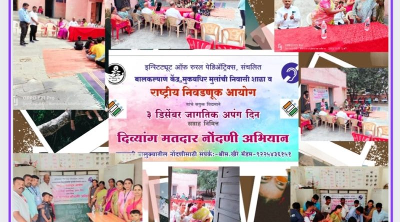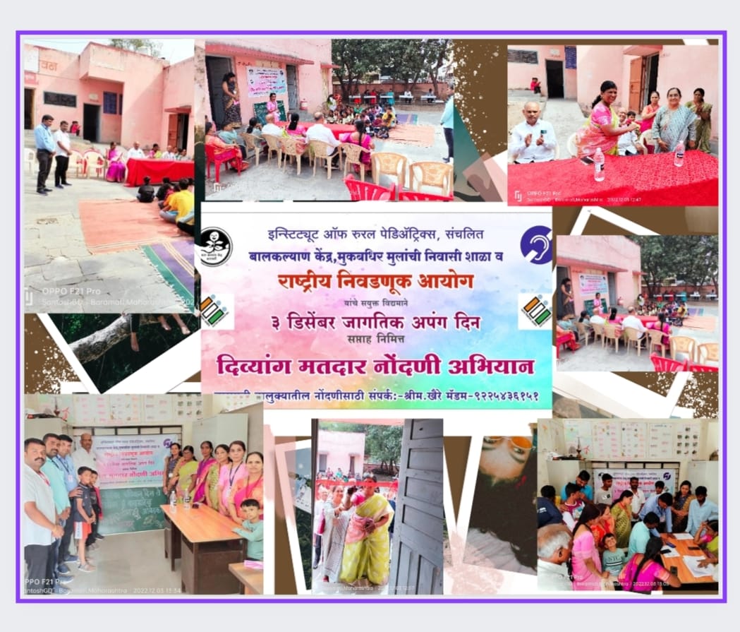 बारामती : बाल कल्याण केंद्र मूकबधिर मुलांची निवासी शाळा व राष्ट्रीय निवडणूक आयोग यांच्या संयुक्त विद्यमाने बाल कल्याण केंद्र मूकबधिर मुलांची निवासी शाळा येथे 3 डिसेंबर रोजी जागतिक दिव्यांग दिन व दिव्यांग मतदार नोंदणी अभियान कार्यक्रम उत्साहात पार पडला. यामध्ये बारामती तालुक्यातील सर्व प्रकारचे दिव्यांग अठरा वर्षापुढील यांची मतदान नोंदणी करण्यात आली.या कार्यक्रमादरम्यान प्रमुख पाहुणे म्हणून बारामतीचे नायब तहसीलदार सौ शिंदे मॅडम उपस्थित होत्या व प्रमुख उपस्थिती संस्थेचे अध्यक्ष डॉ अनिल मोकाशी सर, खजिनदार माधुरी मोकाशी मॅडम, सचिव संदीप मुळीक सर, मुख्याध्यापिका मालती खैरे मॅडम व व शिक्षक व शिक्षकेतर कर्मचारी उपस्थित होते कार्यक्रमाचे सूत्रसंचालन शिवानी काळे मॅडम यांनी केले व आभार अश्विनी मुळीक मॅडम यांनी मानले