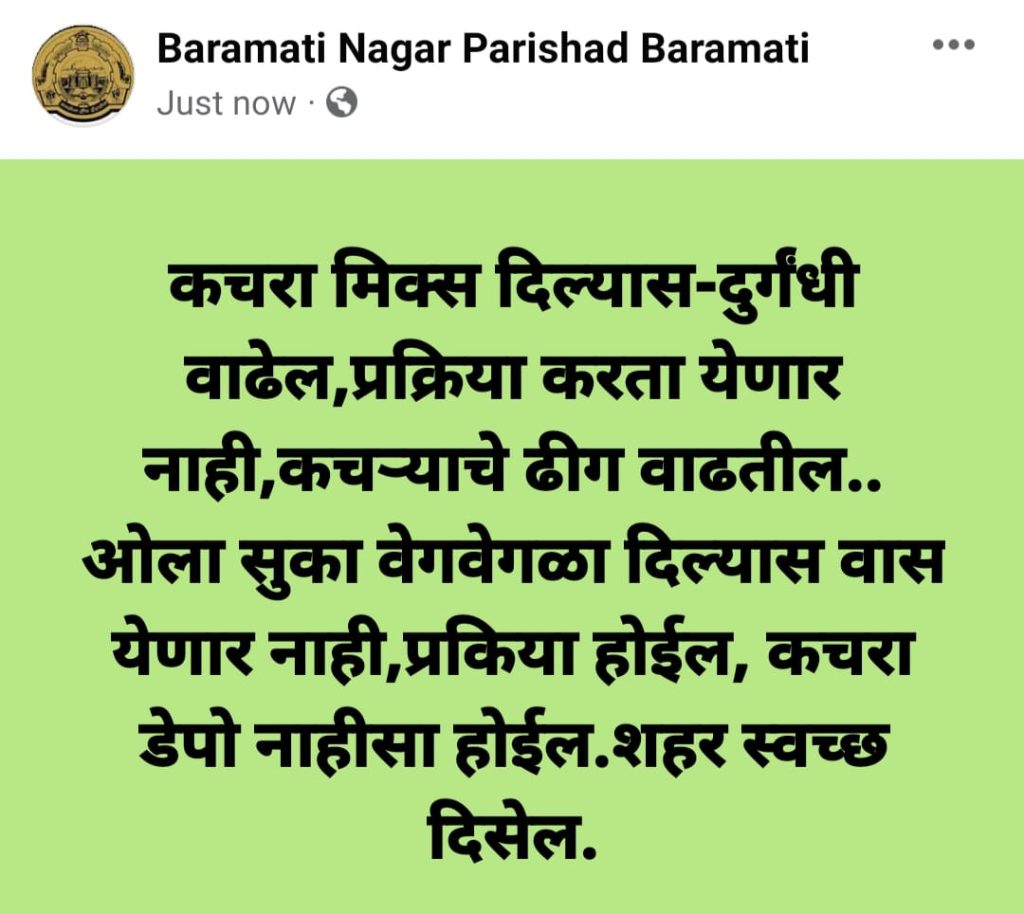 कचरा एकत्रित दिल्यावर दुर्गंधी वाढते.त्याच्यावर प्रक्रिया करता येत नाही. कचरा ओला व सुका वेग वेगळा करून घंटागाडी कडे दिल्यास कचऱ्यावर प्रक्रिया करता येईल.कचरा डेपो नाहीसा होईल.दुर्गंधी पसरणार नाही. बारामती शहर स्वच्छ सुंदर बनेल. अशी माहिती सोशल मीडियाद्वारे बारामती नगरपरिषदेने देऊन नागरिकांना कचरा ओला सुका वेगळा करून द्यावा याबाबत आवाहन केले आहे.