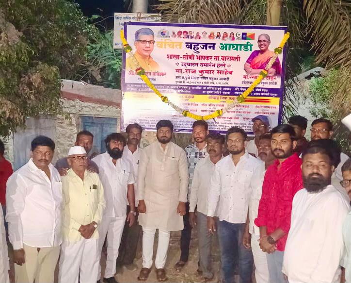 बारामती : वंचित बहुजन आघाडीचे राष्ट्रीय अध्यक्ष आदरणीय ॲड. बाळासाहेब आंबेडकर, प्रदेशअध्यक्षा मा. रेखाताई ठाकुर व जिल्हा प्रभारी प्रा. किसन चव्हाण सर यांच्या आदेशाने पुणे जिल्हा अध्यक्ष मा. राज कुमार यांच्या अध्यक्षते खाली तसेच पुणे जिल्हा पूर्व उपाध्यक्ष सतिश साळवे, महासचिव नवनाथ गायकवाड, मंगलदास निकाळजे, प्रसिद्धी प्रमुख रेवणनाथ वेताळ, संपर्क प्रमुख ॲड. वैभव कांबळे, सचिव ॲड वैभव काळे, संघटक सुजय रणदिवे, साईनाथ लोंढे, गोविंद कांबळे, ॲड बाबाजान शेख, बारामती तालुका अध्यक्ष रामदास जगताप, इंदापूर तालुका अध्यक्ष मनोज साबळे यांच्या उपस्थिती मध्ये जिल्हा अध्यक्ष राज कुमार यांच्या हस्ते शाखा उद्घाटन ककरण्यात आले, यावेळी कार्यक्रमाची प्रस्तावना इंदापूर तालुका अध्यक्ष मनोज साबळे यांनी केली यावेळी जिल्हा अध्यक्ष राज कुमार, मंगलदास निकाळजे, साईनाथ लोंढे, सुजय रणदिवे, तालुका अध्यक्ष रामदास जगताप यांनी मनोगत व्यक्त केले. वंचित बहुजन आघाडीचे राष्ट्रीय अध्यक्ष आदरणीय बाळासाहेब आंबेडकरांनी आदेश दिल्याप्रमाणे विश्वरत्न डॉ बाबासाहेब आंबेडकर यांची जयंती मोठ्या थाटात साजरी करण्याच्या सूचना दिल्या, आभार प्रदर्शन लोणी भापकर शाखा अध्यक्ष मच्छिन्द्र कडाळे व शाखा प्रमुख दादा कडाळे यांनी केले, यावेळी ॲड. विवेक बेडके, गौतम कांबळे, संतोष कांबळे, ज्योतीबा खरात, राजेंद्र जगताप, आनंद जाधव, मंगेश सोनवणे, आर्यन साळवे, गणेश थोरात, माळेगाव शहर अध्यक्ष अण्णा घोडके, उपाध्यक्ष रमेश शिंदे, शिवनगर शाखा अध्यक्ष शंकर राणे, विनय दामोदरे, मंगेश सोनवणे, चैतन्य काकडे, सुशिल सोनवणे, महेश सोनवणे, जितेंद्र कवडे, कृष्णा साळूंके, राजेश मदने, कुमार माने, हनुमंत दीक्षित, मतीन तांबोळी, मच्छिंद्र कडाळे, सोमनाथ पवार, सुरज कडाळे, रमेश पवार, विशाल आवाडे, मोहम्मद तांबोळी, कल्याण बारवकर, अमोल पवार, गजानन चोपडे, शंकर देशमाने, किशोर सकाटे, अविनाश ठोंबरे, सुभाष गडदे, राजेंद्र दीक्षित, आदी कार्यकर्ते व ग्रामस्थ मोठ्या संख्येने उपस्थित होते.