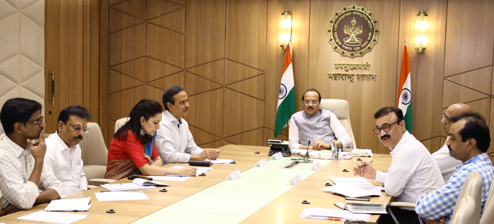 उपमुख्यमंत्री अजित पवार यांच्या अध्यक्षतेखाली आज मंत्रालयातील त्यांच्या दालनात बारामती येथे होणाऱ्या विभागास्तरीय नमो महारोजगार मेळाव्यासंदर्भात आढावा बैठक झाली. बैठकीस कौशल्य, रोजगार, उद्योजकता, नाविन्यता विभागाचे अपर मुख्य सचिव ओ.पी. गुप्ता, पोलीस महासंचालक रश्मी शुक्ला, नियोजन विभागाचे प्रधान सचिव सौरभ विजय, राज्य नाविन्यता व कौशल्य विकास सोसायटीच्या आयुक्त निधी चौधरी, पुण्याचे विभागीय आयुक्त डॉ. चंद्रकांत पुलकुंडवार, मुख्यमंत्री कार्यालयाचे विशेष कार्यकारी अधिकारी बाळसिंग राजपूत, रोजगार आयुक्तालयाचे उपायुक्त डी. डी. पवार, महाराष्ट्र राज्य कौशल्य विकास सोसायटीचे अतिरिक्त मुख्य कार्यकारी अधिकारी अनिल सोनवणे, कौशल्य विकास मंत्र्यांचे विशेष कार्यकारी अधिकारी दिलीप हिरवाळे आदी वरिष्ठ अधिकारी उपस्थित होते. सांगलीचे जिल्हाधिकारी डॉ. राजा दयानिधी, पुण्याचे पोलीस अधीक्षक पंकज देशमुख, महाराष्ट्र राज्य परिवहन महामंडळाचे व्यवस्थापकीय संचालक डॉ. माधव कुसेकर, विविध जिल्ह्यांचे व विभागांचे क्षेत्रीय अधिकारी, बारामती येथील स्थानिक अधिकारी दूरदृष्य प्रणालीद्वारे बैठकीत सहभागी झाले होते.